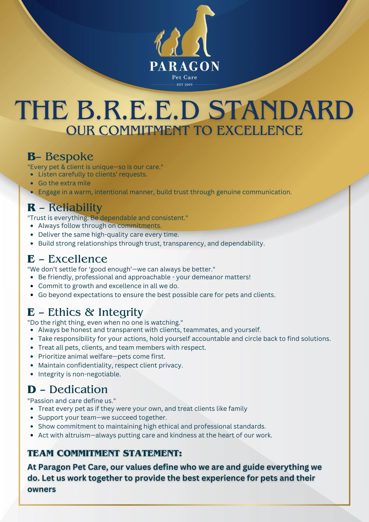 At Paragon Pet Care, we believe professionalism, reliability, and animal welfare should never be optional. From a well-presented, highly skilled team, to safe practices and clear communication, we consistently deliver what others too often overlook.
